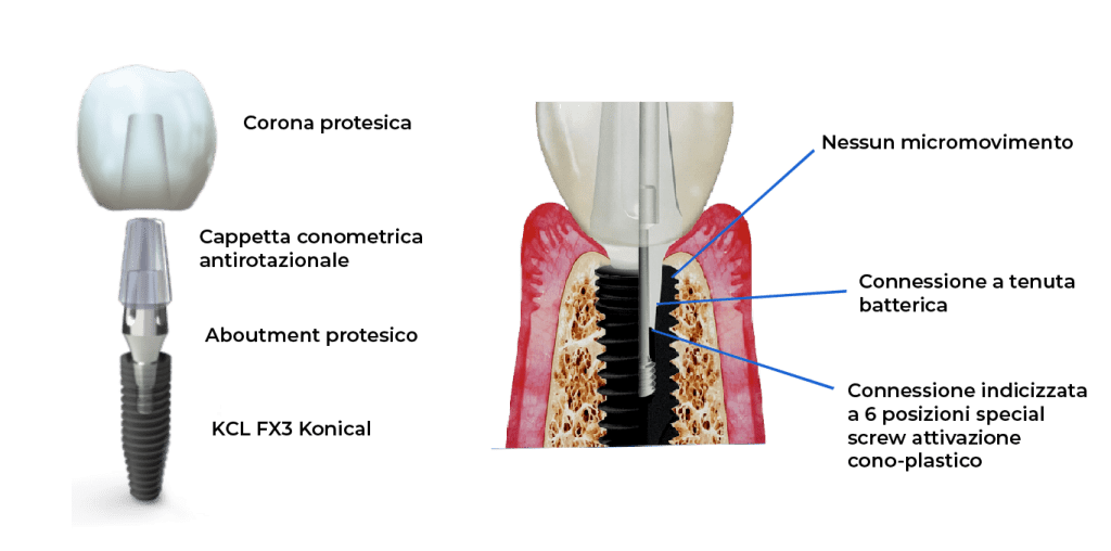 Il sistema garantisce un’ampia gamma di soluzioni implanto-protesiche per la realizzazione di protesi singole e/o multiple a livello del moncone supportate da matrici secondarie prefabbricate con connessione conica.